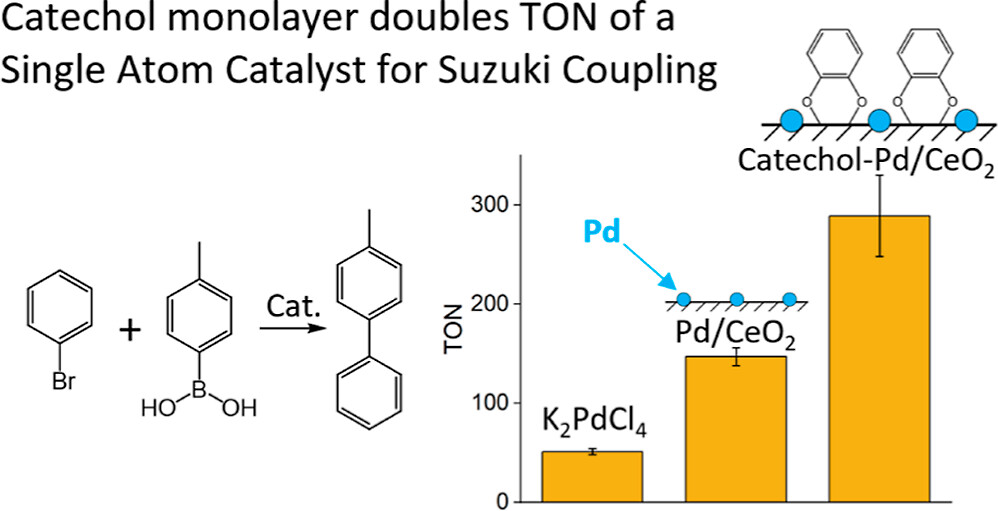 A coating of catechol molecules doubles the turnover number of a Pd/CeO2 SAC toward a Suzuki cross-coupling reaction.